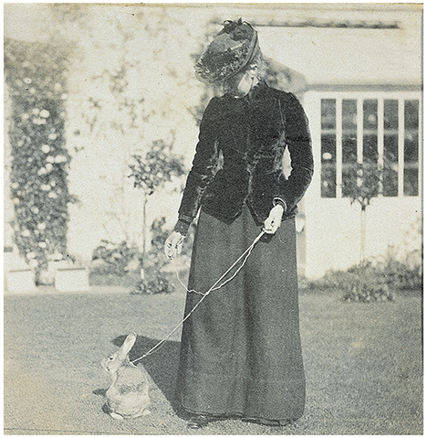 In addition to the Jemima stuffed animal, Cotsen has a number of Beatrix Potter’s family photographs (you can browse them here). Several photos include Beatrix with her beloved pets, so we put together an exhibit wall of eight photos, including this one of Beatrix and Benjamin Bouncer: