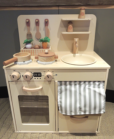 And just a few steps away is the kitchen! This was a cute wooden set we scored inexpensively online, we removed the peg legs to make it extra stable for young enthusiastic chefs.