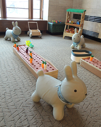 Meanwhile, over in the garden, we had two “plantable” vegetable beds, fabric carrots, garden carts, a well-stocked produce stand, and a trio of bunny bouncers!
