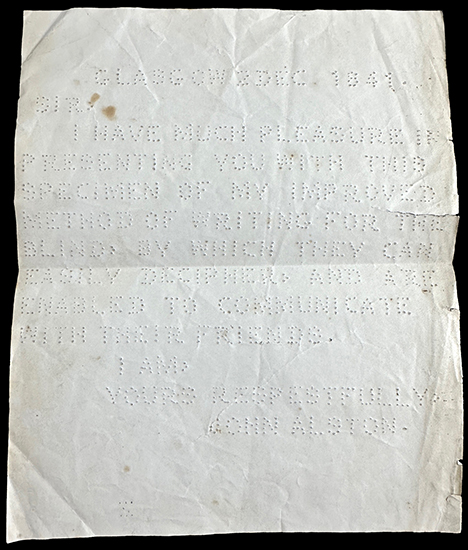 Alston’s desire was for every blind person in the United Kingdom to have an opportunity to read and learn from the Alston Type books. In a letter sent to directors of institutions throughout Great Britain, he stated: “The advantage to the Blind in having books printed for their use, in a distinct and tangible character is incalculable.”1 Alston was awarded a government grant to assist with printing and by 1844, more than 14,000 volumes were available for purchase. All of the sales proceeds were used to print more Alston Type books.