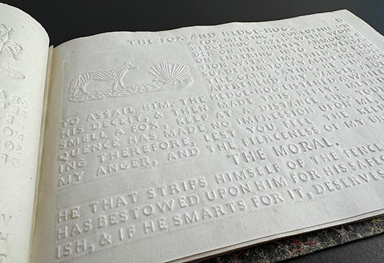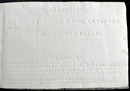 A Selection of Fables with Wood Cuts, for the Use of the Blind by John Alston (1838). The Treasures of the Cotsen Children’s Library Collection, CTSN 40903 Eng 18, Department of Special Collections, Princeton University Library.