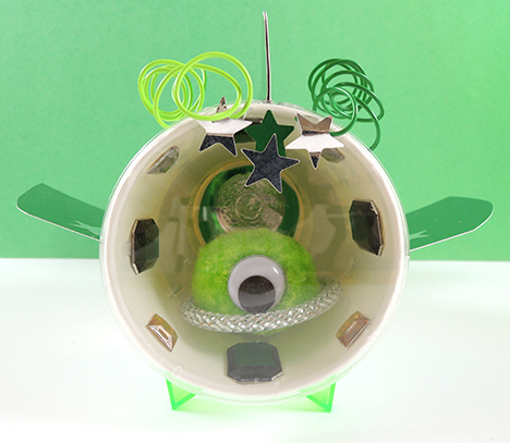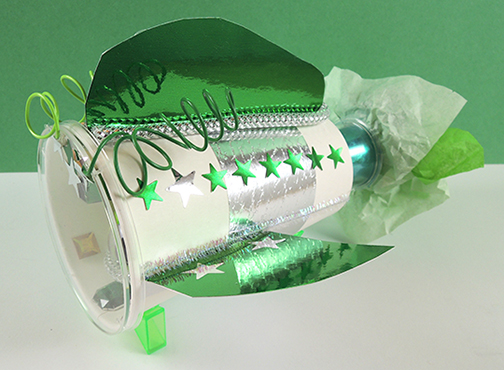 As you can see, this rocket is a paper cup propped up on little legs. We had some extra Petri dish lids (leftover from this Hobbit door project) that made terrific windshields, but that’s totally optional!