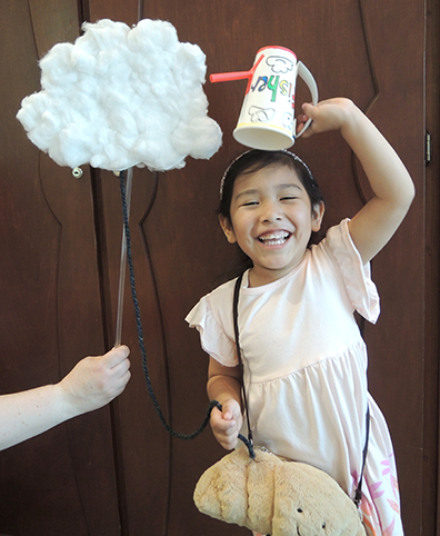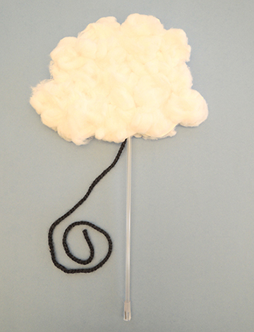 To make a cloud, fold a 12″ x 28″ piece of poster board in half, then trace your cloud’s shape on the paper. Cut out the shape, and you have two matching cloud pieces. Cover the outer sides of each cloud piece with cotton balls. When you’re done, use the packing tape to attach the rod to the inside of one cloud piece, then hot glue the other piece on top. Add a piece of string or yarn for your cloud’s leash, just like the book!